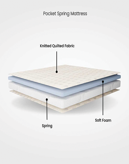 Pocket spring mattress with individually wrapped springs offering motion isolation, body support, and luxurious comfort for uninterrupted, restful sleep.